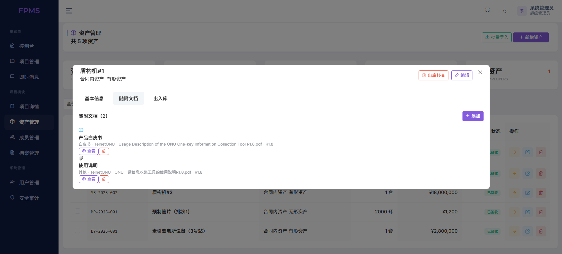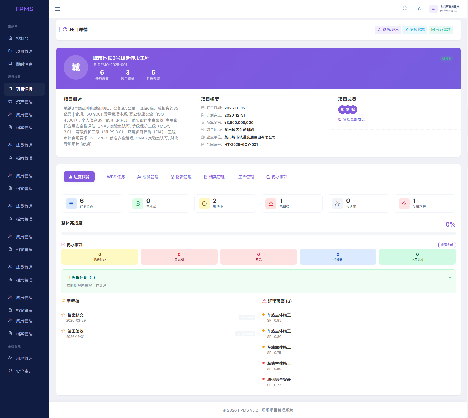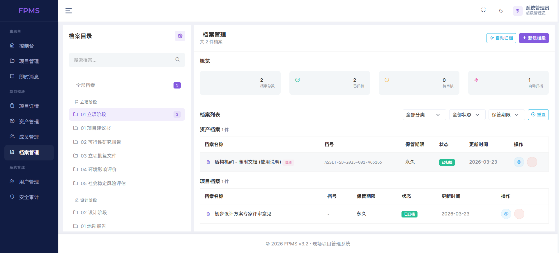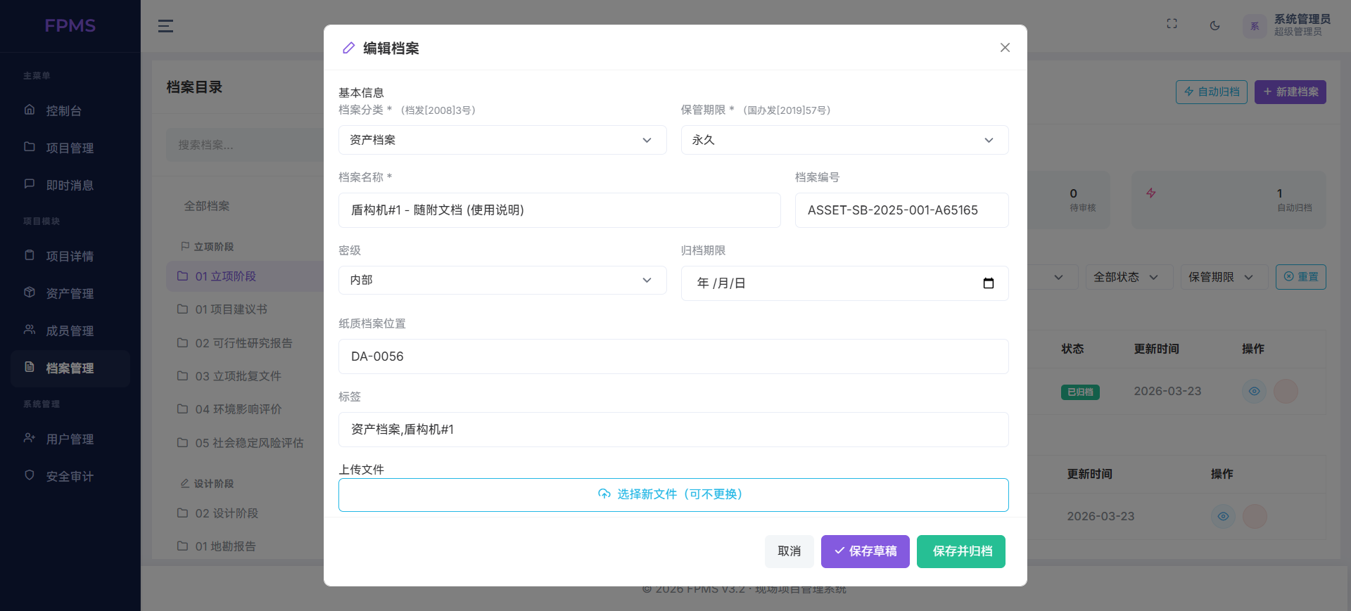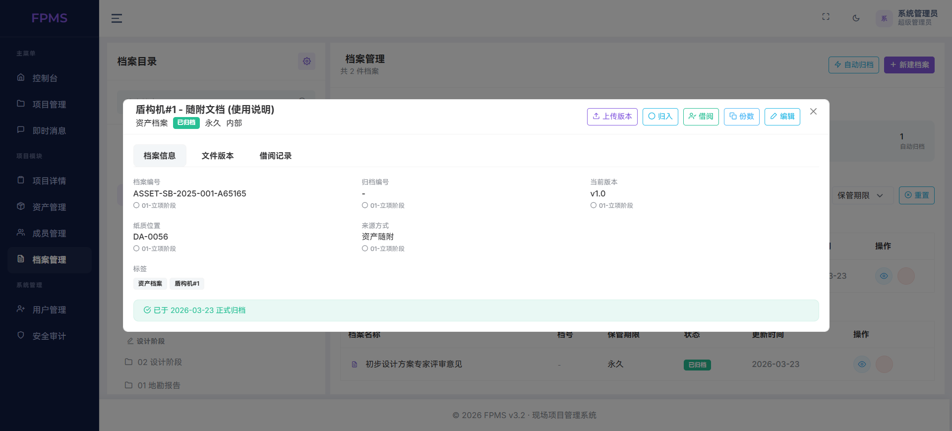 档案管理则承担了合规闭环的重要角色。系统支持标准化档案编号、自动归档、版本管理与借阅记录,可关联立项、设计、施工等不同阶段资料,形成“项目—资产—档案”三位一体的追溯体系,满足审计、验收与长期保管需求。此外,成员权限管理、工单流转、待办事项提醒等辅助模块,进一步保障了多角色协同高效、权责分明。