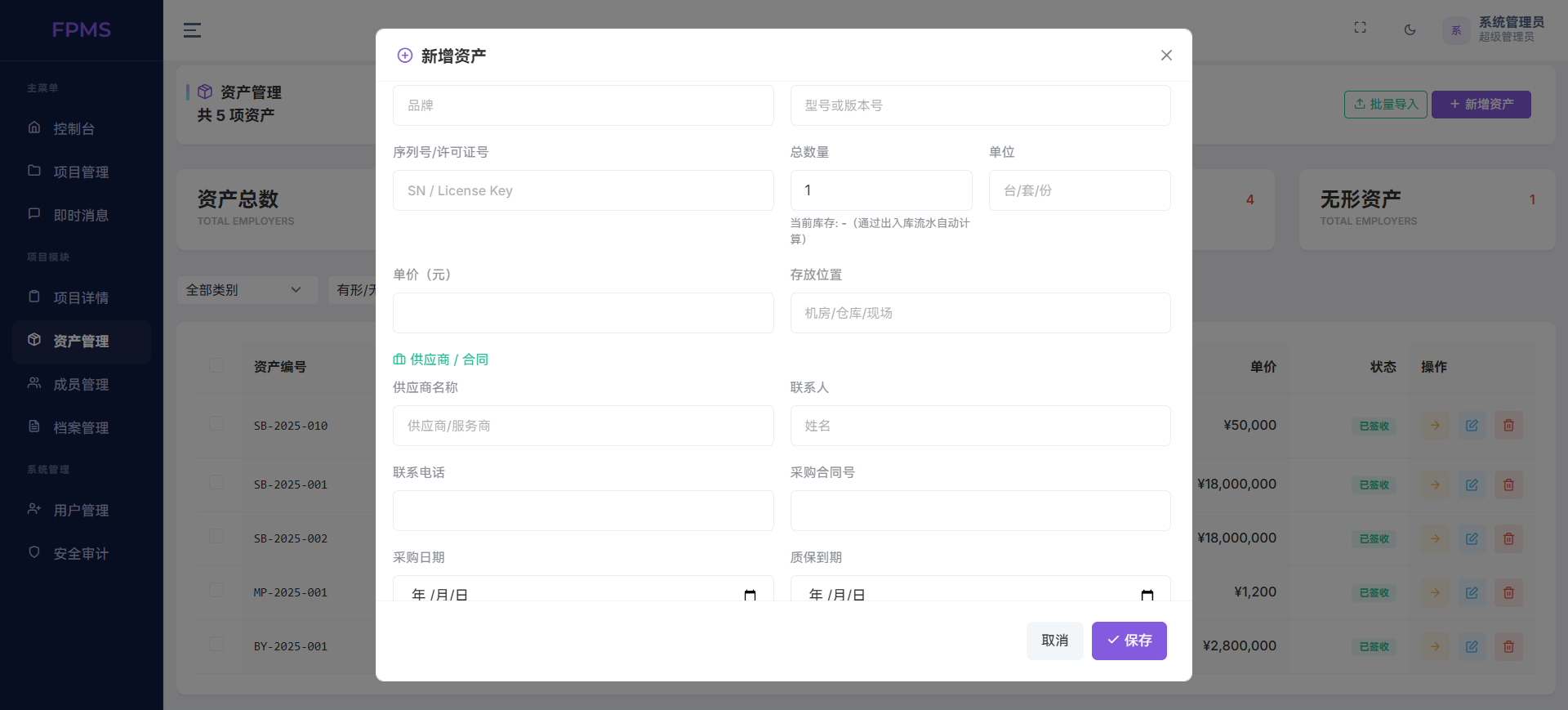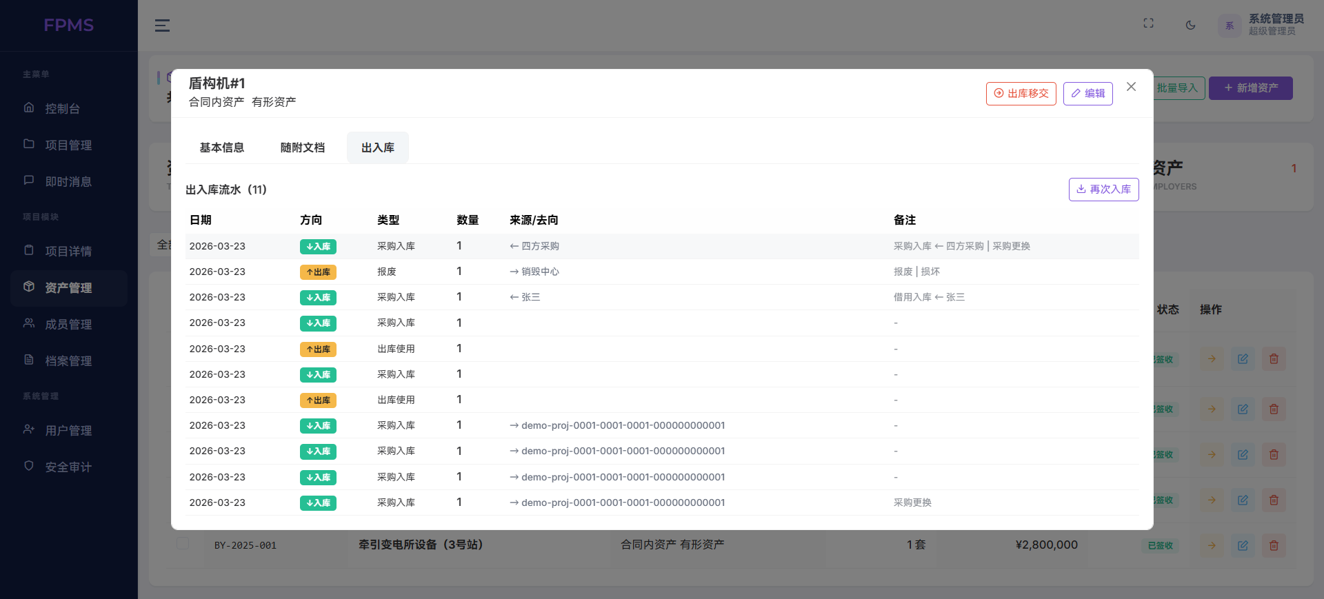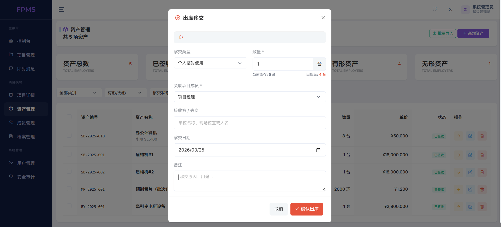 资产管理是系统的重点特色之一。针对工程设备多、价值高、流转频繁的特点,系统支持资产信息完整录入,包含品牌、序列号、单价、质保期等关键字段,并提供Excel批量导入功能,可灵活选择重复跳过或覆盖模式,大幅提升入库效率。同时实现资产全流程可追溯,从采购入库、出库移交、借调到报废更换,自动记录流水并实时核算库存,让每一台设备去向清晰、责任明确。