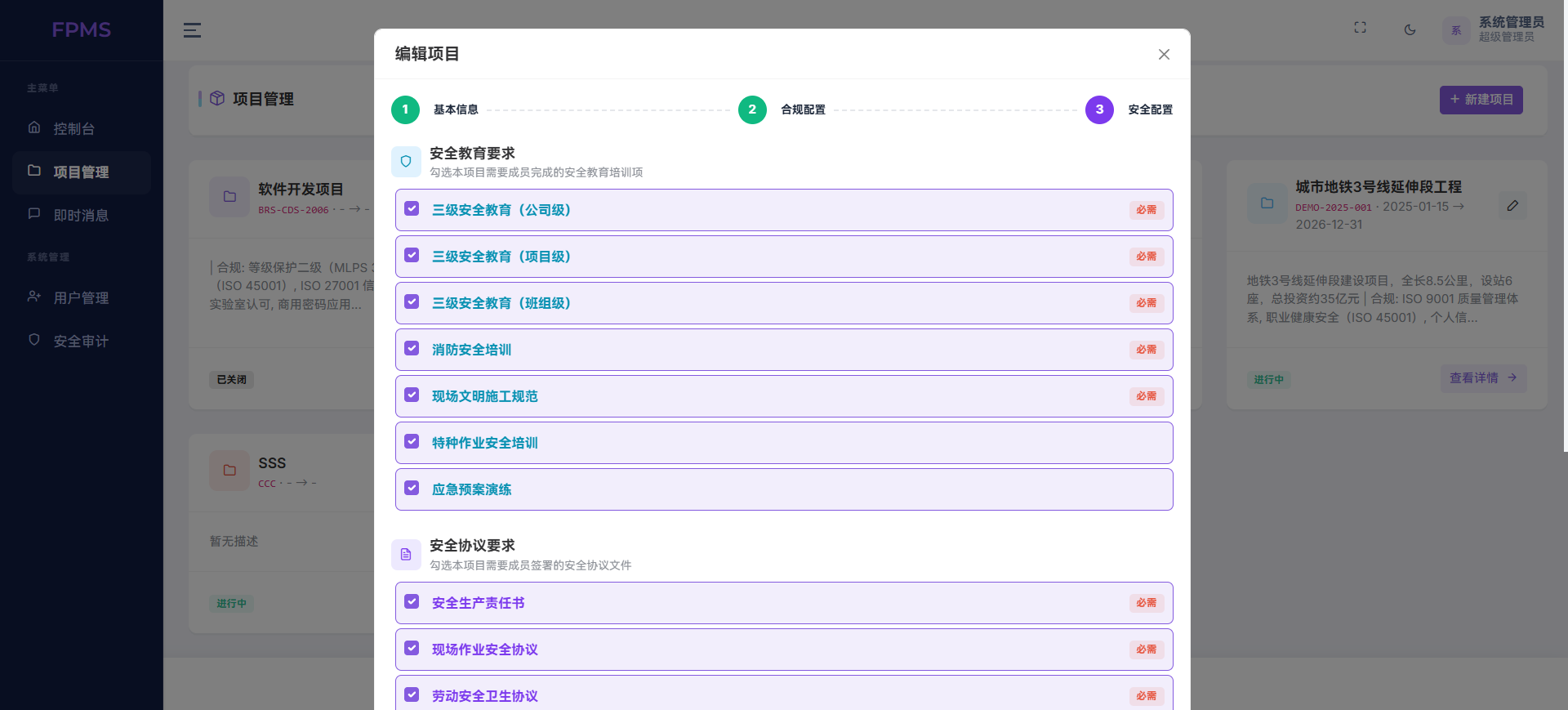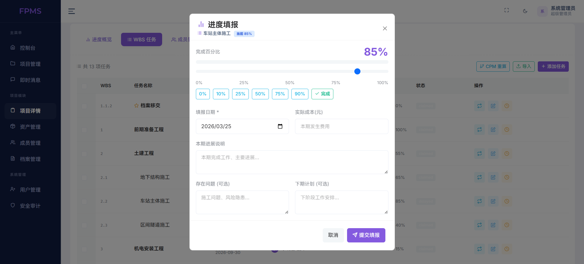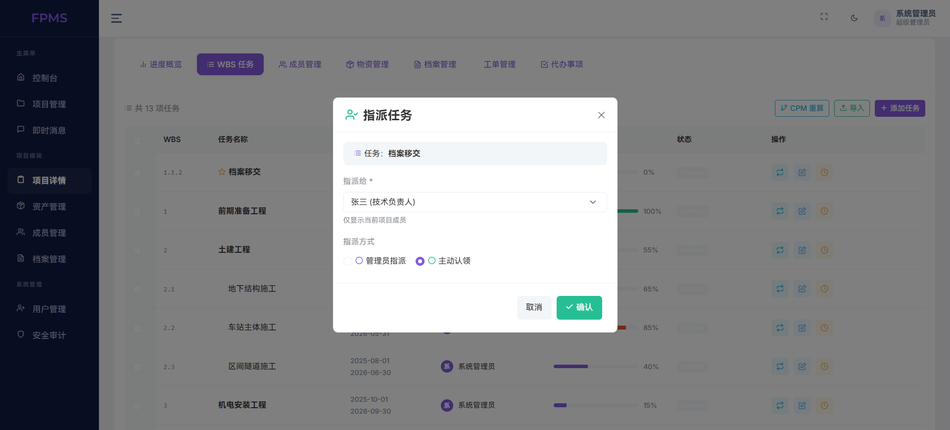 在项目管理模块,系统支持完整的项目创建、编辑与进度跟踪,可直接绑定等级保护、ISO体系、CNAS等合规标准,从源头满足工程与科技类项目的合规要求。通过WBS任务拆解、成员指派、进度状态更新,实现任务分层管理与实时同步,配合进度预警与逾期提醒,有效避免项目延期、责任不清等问题。