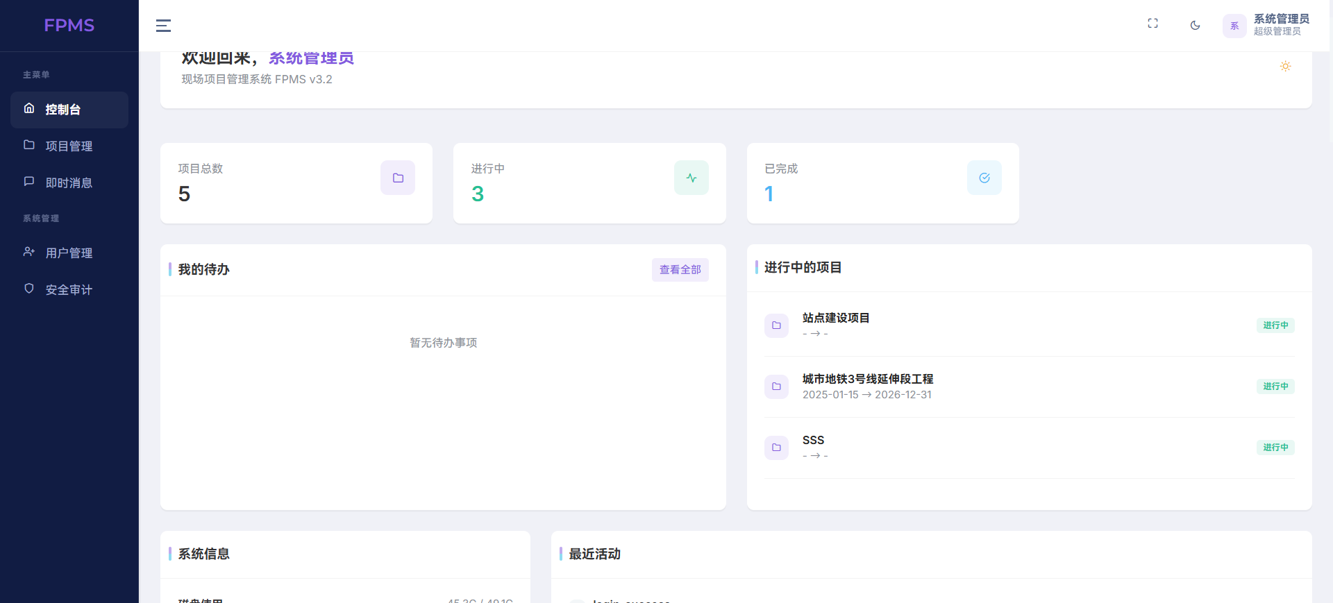 这套项目管理系统以全生命周期管控为核心,围绕“项目进度、资产流转、档案合规”三大主线,构建了从立项到归档的完整业务闭环。系统控制台直观展示项目总数、进行中与已完成项目统计、待办事项及核心项目清单,让管理者一眼掌握全局态势,实现高效决策与快速跳转。